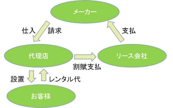 - 支払い方法 月末締で仕入した台数分(2週間お試しに必要になった機材)での請求書がメーカーからきますのでリース会社の割賦販売でメーカーに全額支払います。仕入れた機材は翌月からレンタル代金が発生しますのでそのレンタル代金から割賦販売の月額返済を支払いますので翌月より利益の確保が可能です。